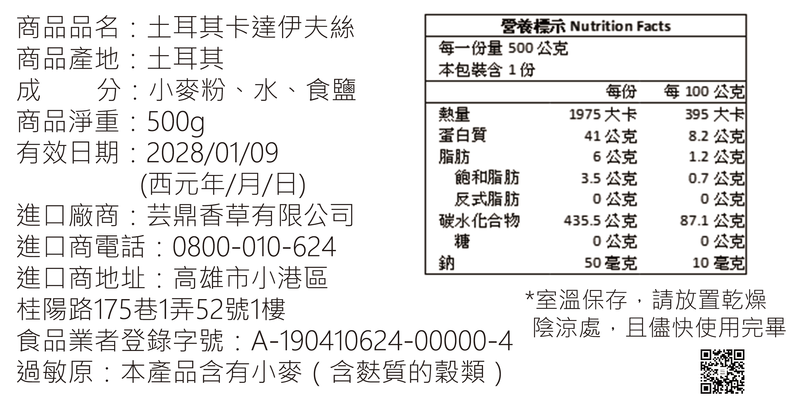 土耳其卡達伊夫營養標籤